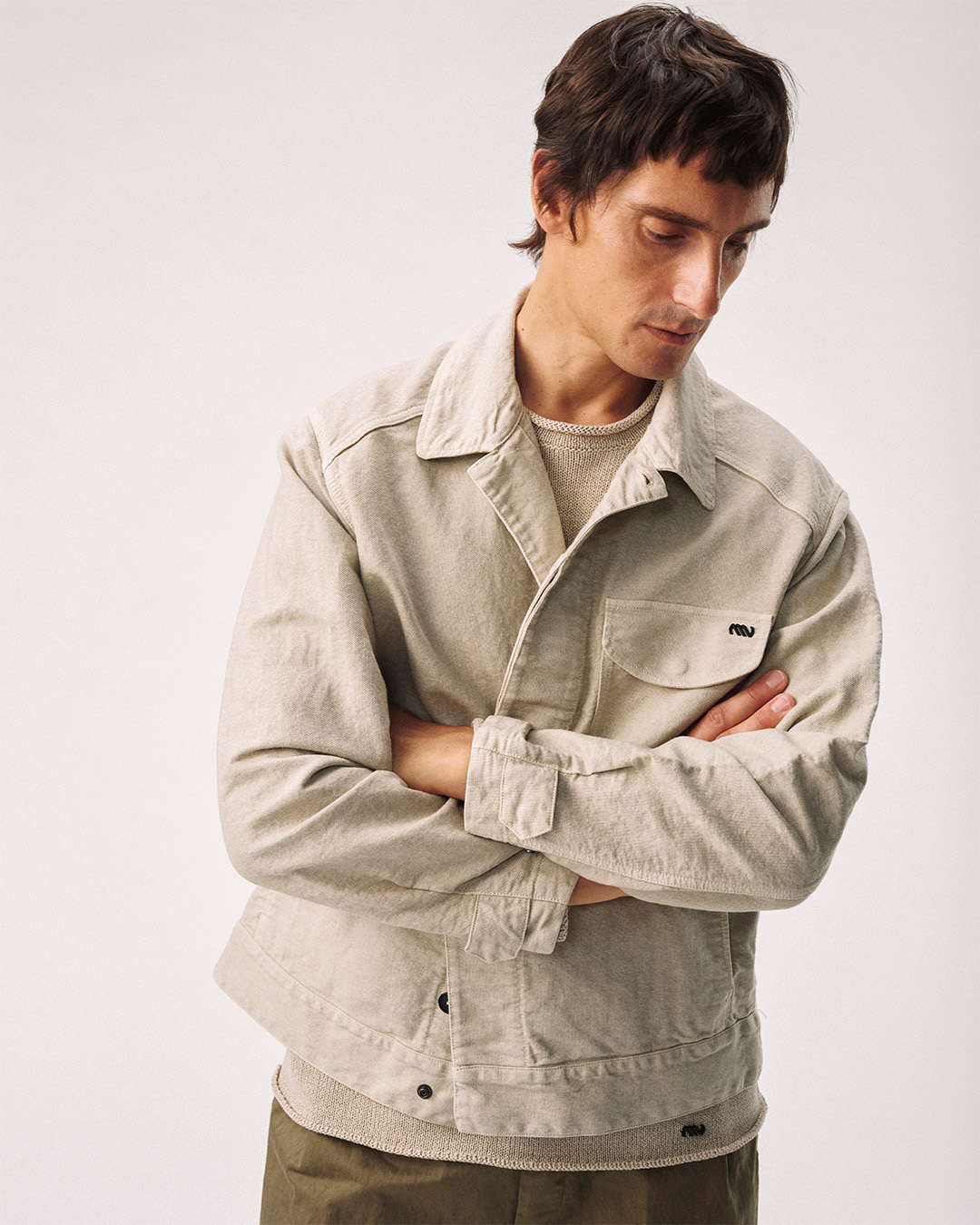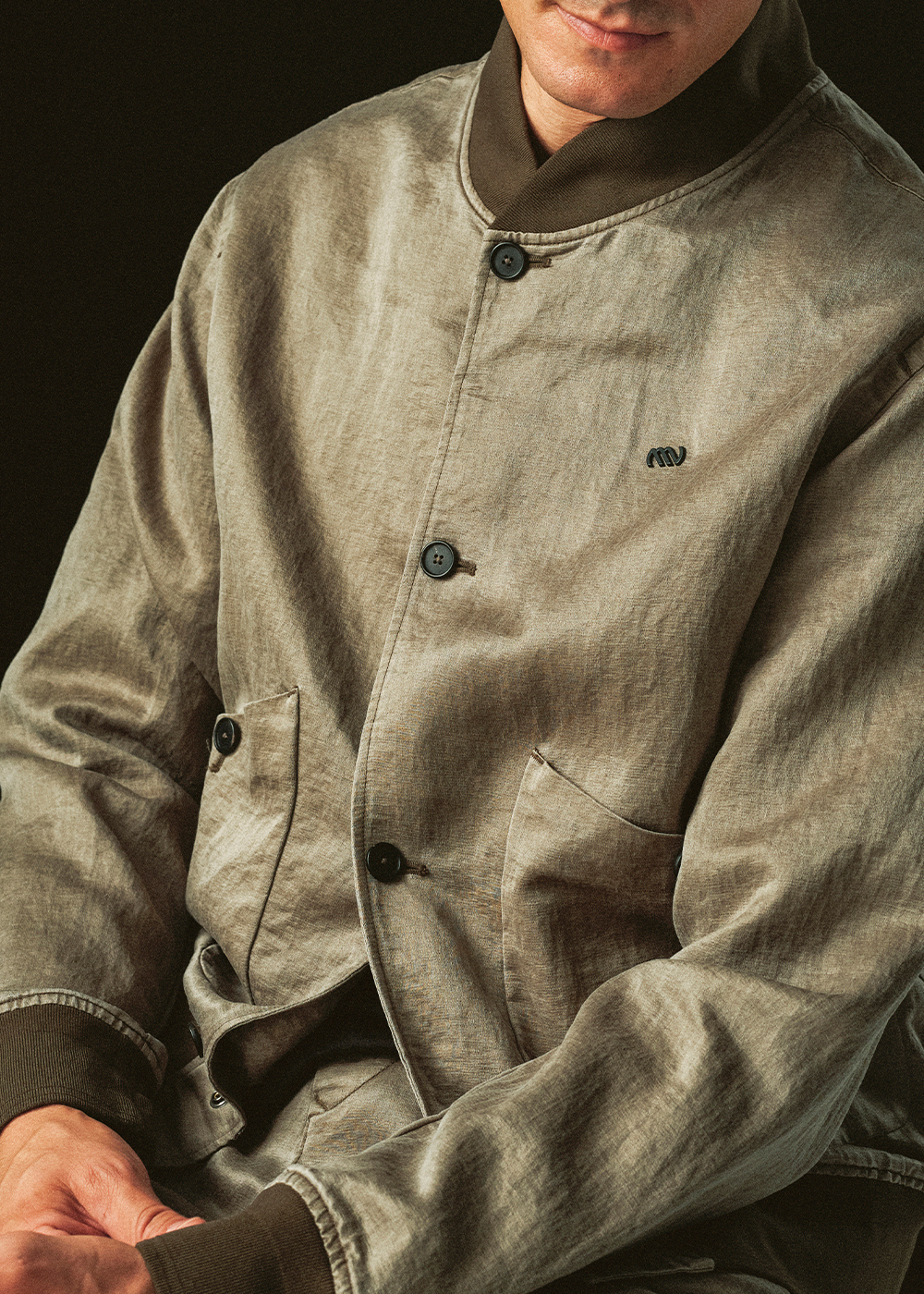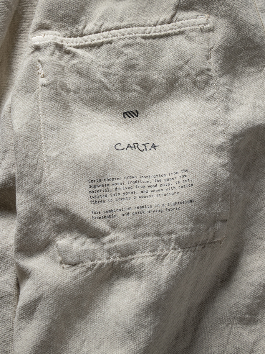 Chapter 14 draws inspiration from traditional Japanese Washi paper, reinterpreted through Massimo Osti Studio’s innovative approach. The paper-based raw material, derived from wood pulp, is transformed into yarns and woven with cotton fibres, creating a distinctive canvas structure. The garment dyeing process with an “Old” effect further enhances the fabric, enriching its texture and chromatic depth.